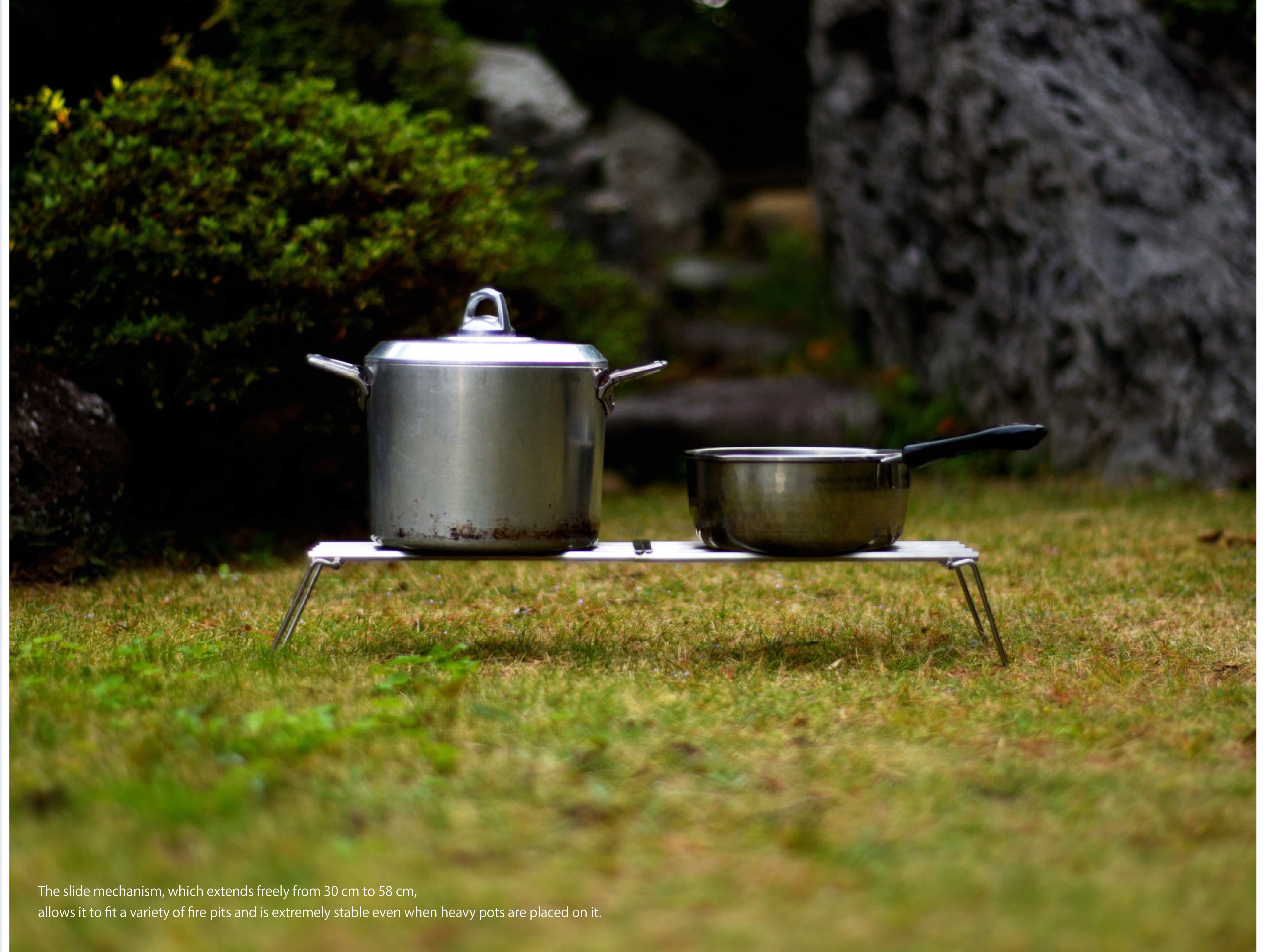 This 10cm-high freestanding trivet is ideal for cooking on an alcohol stove. The sliding expandable design allows you to use one side of the trivet for cooking while the other side can be used as a cooktop without worrying about heat, a feature only possible with stainless-steel with low heat conductivity. Extends up to 58 cm to fit any fire pit. This versatile unit is a must-have item